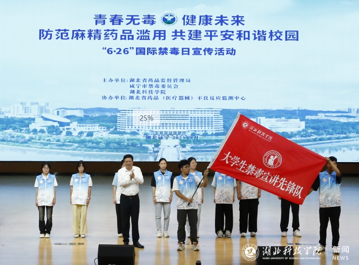 活动仪式上,咸宁市委副书记、市长、市禁毒委主任杨军向湖北科技学院“大学生禁毒宣讲先锋队”授旗;我校党委书记闫英姿在致辞中呼吁守护青春净土;学生代表宣读《拒绝麻精药品滥用倡议书》,展现青年担当。