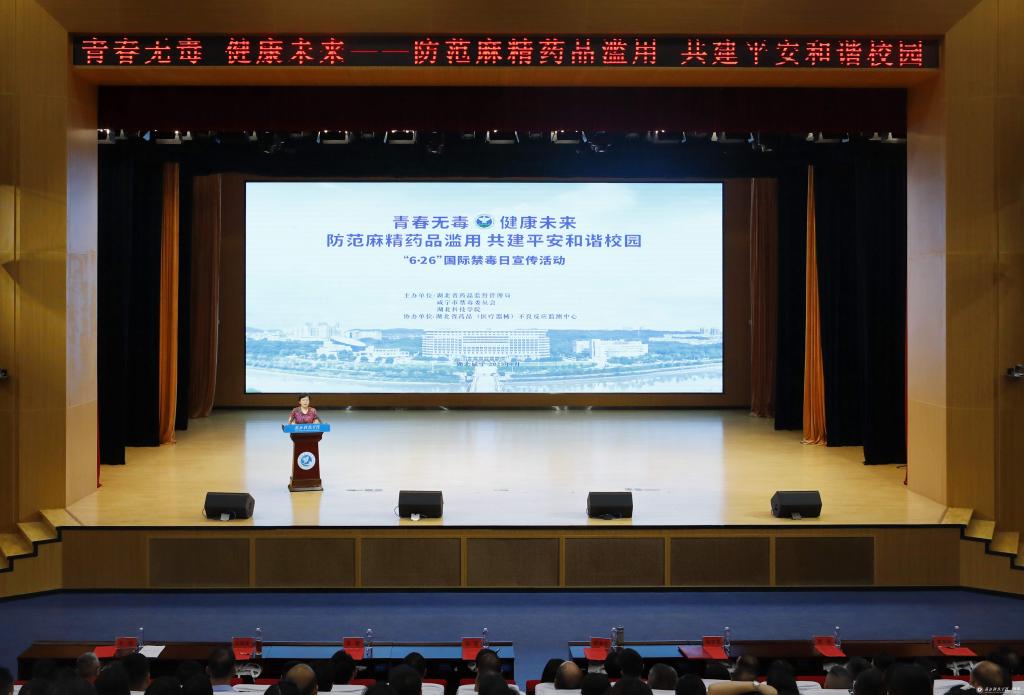 为全面提升青少年对毒品和药物滥用危害的认知水平,进一步普及预防麻精药品滥用知识,在第38个“6・26”国际禁毒日来临之际,由湖北省药品监督管理局、省药品(医疗器械)不良反应监测中心会同咸宁市市场监督管理局、咸宁市禁毒委和我校共同举办2025年“青春无毒•健康未来——防范麻精药品滥用,共建平安和谐校园”禁毒专题宣传活动在揽胜楼学术报告厅举行。